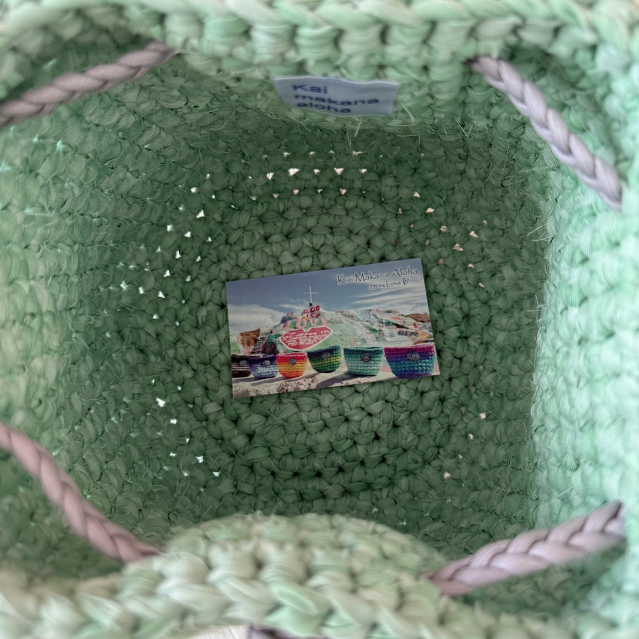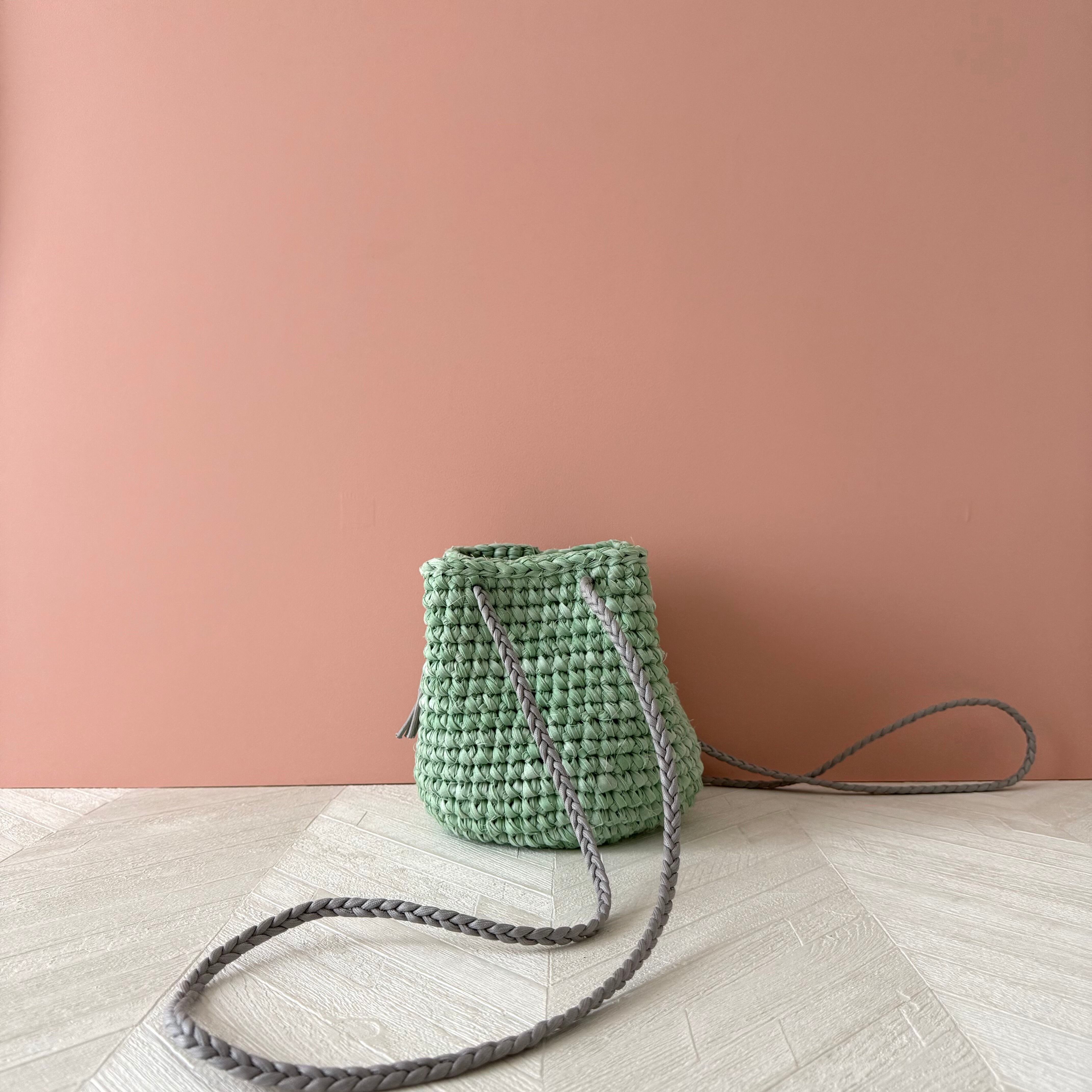 シュークリームのようにコロンとした巾着タイプのバッグ